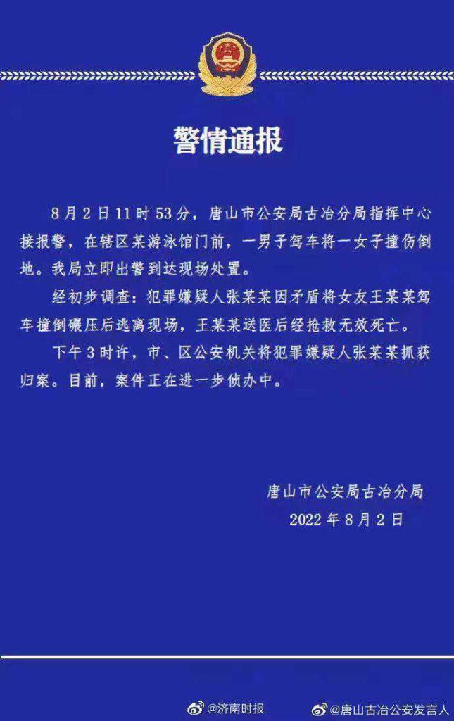 8月2日11时许,河北唐山一男子驾车在古冶区某游泳馆门前将一女子撞伤。画面显示,一男子刀小刀黑料不打烊驾车多次碾压躺在地上的女子。16时许,唐山市古冶区分局发布通报称,嫌疑人张某某已被抓获,张某某与被撞女子为情侣关系,被撞女子送医后因抢救无效死亡。