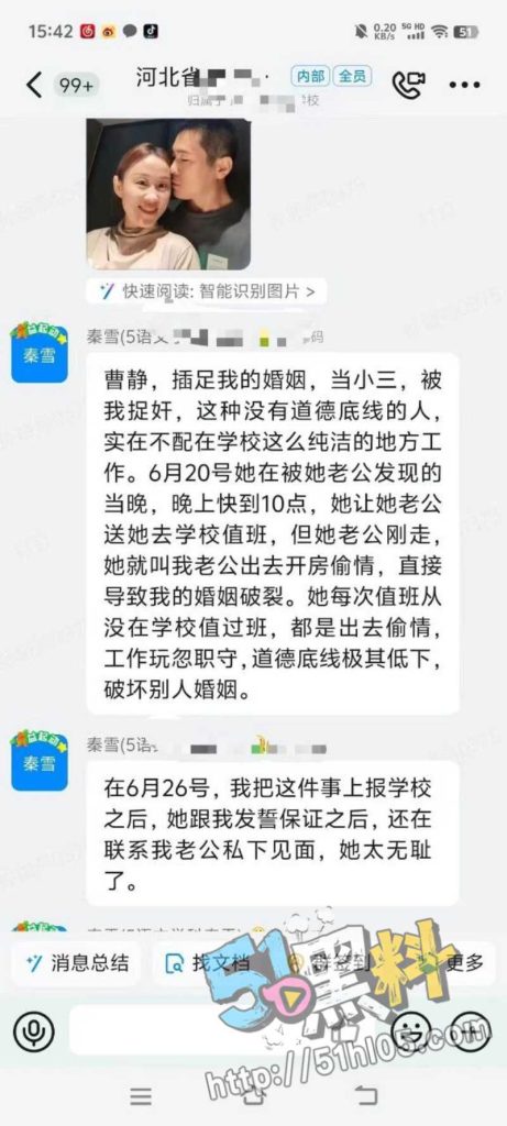 河北肃宁育英学校已婚女老师曹静偷情人夫,两人的聊天记录被男方妻子发到学校上千人的群里,聊天内容不堪入目黑料不打烊ZZZTTT姐妹花,两个人多次在曹静值班期间出去开房,这样不敬业的人也配当老师?真的太荒黑料女生复仇记在线播放唐了!