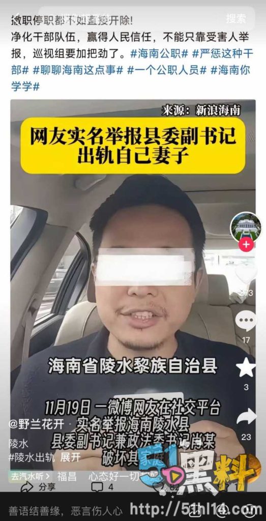 海南陵水县委副书记肖峰偷情有夫之妇被实名举报,大尺度聊天记录与不雅视频疯传全网,女主也是淫荡风骚的让人很下头,自己有老公还出轨当小三,两个人的行为让人惊叹!黑料社区av在线四季女主疯狂吃鸡吧的样子也是真的骚啊!